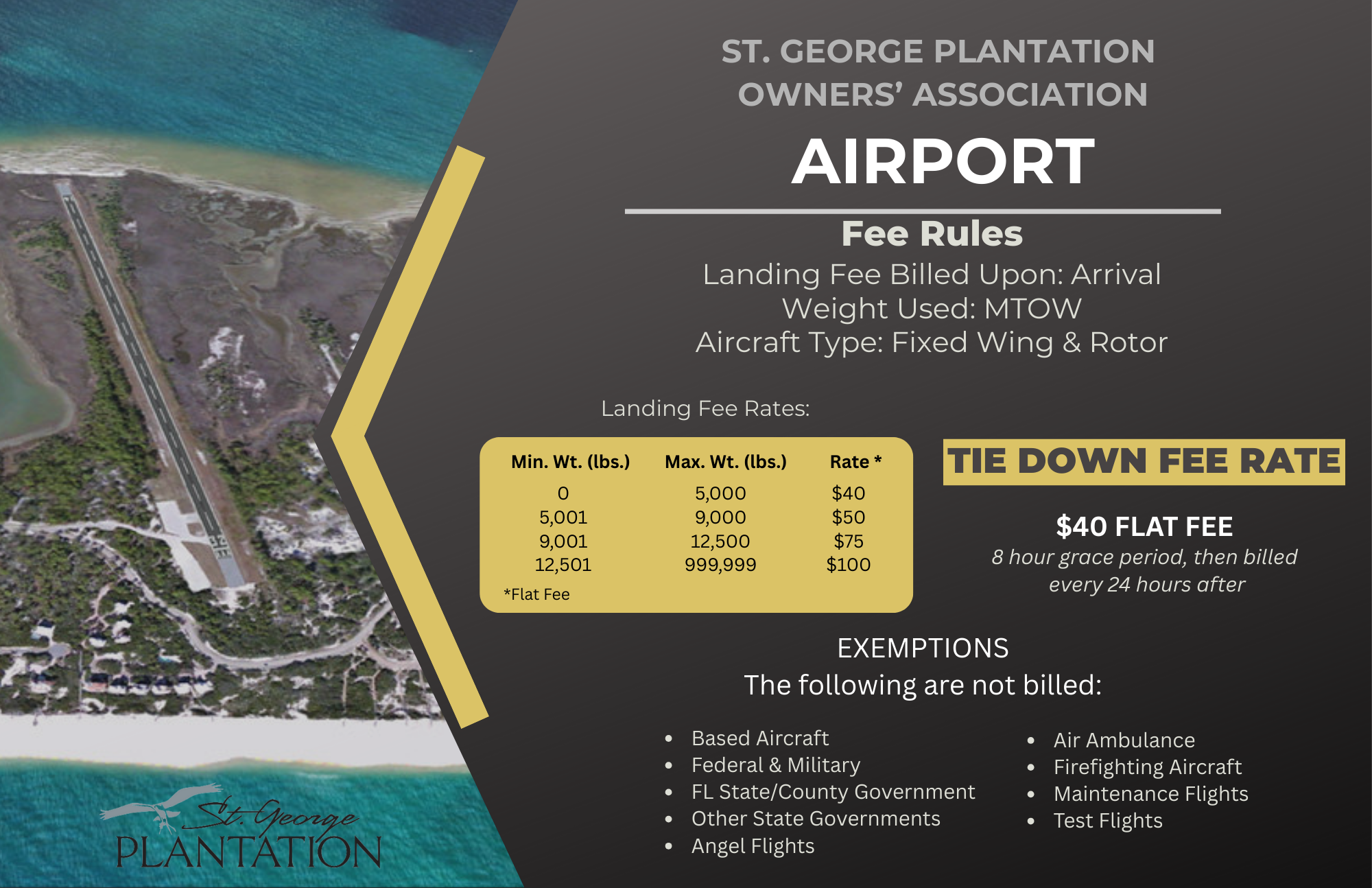The St. George Plantation Owners’ Association (SGPOA) offers owners and authorized guests the convenience of a 3300-foot paved landing strip on the island. Because this FAA-authorized airstrip is located within and maintained solely by a gated community, members of the public are permitted to land, but not to enter the private properties of the community. Any member of the public who wishes to use the airstrip must notify Plantation Security by phone at (850) 927-2362. The Plantation Airport has no lighting, and fuel services are not offered.